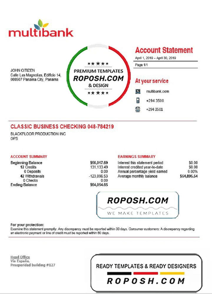 Grab now fully editable Panama Multibank proof of address bank statement Word Template from our website Roposh and put your own info to create Realistic Bank Statement Word template and ready your own novelty documents. It’ll be so beneficial if your Bank Statement is expired, stolen or not available.We also have editable credit card, ID Card psd template, Bank Statement psd template, drivers license psd template & printable editable blank utility bill template.