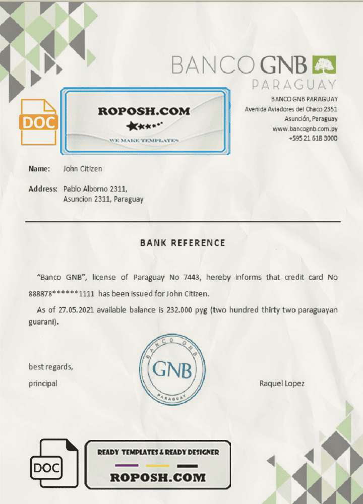 Paraguay Banco GNB bank account reference letter template in Word and PDF format