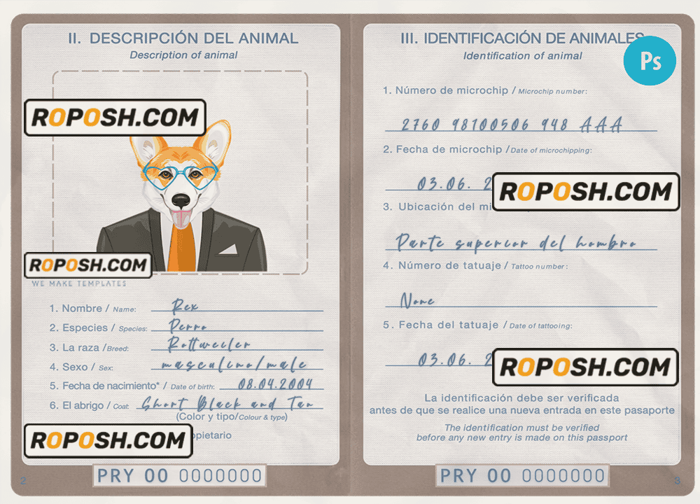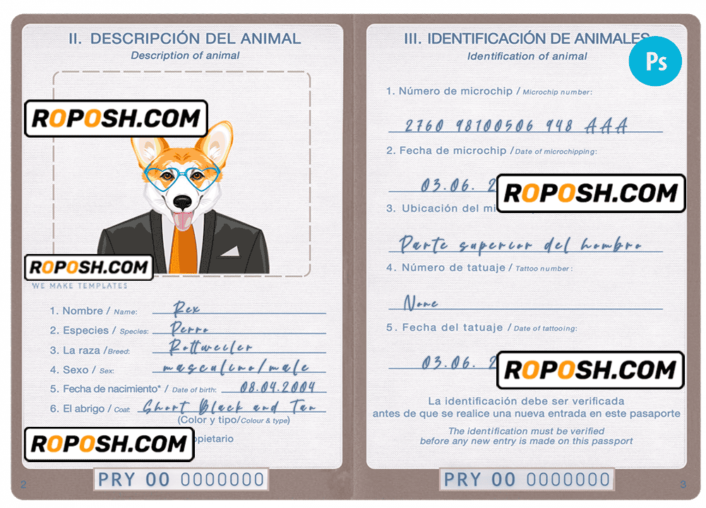 Paraguay dog (animal, pet) passport PSD template, is designed to look and feel like real documents. Each template is carefully crafted to include all the necessary details, such as your pet’s name, breed, date of birth, and microchip information. With our fillable cat or dog passport templates, you can quickly and easily create a editable pet passport that meets all the requirements for international travel.