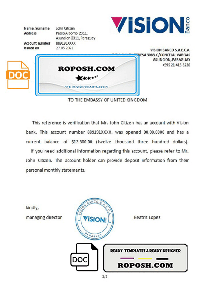 Paraguay Vision Banco bank account reference letter template in Word and PDF format