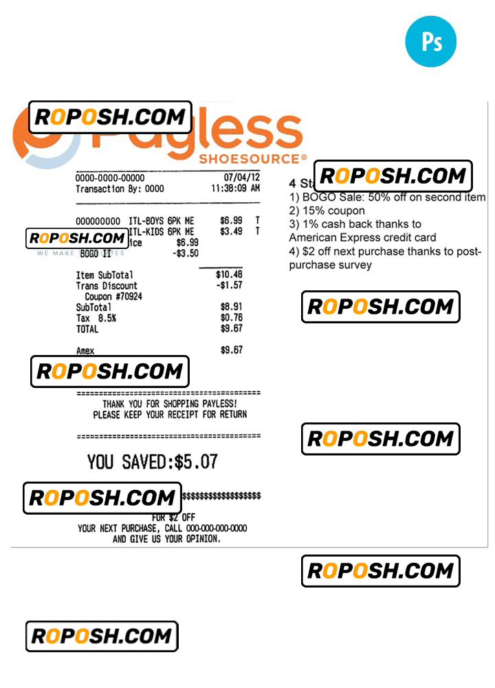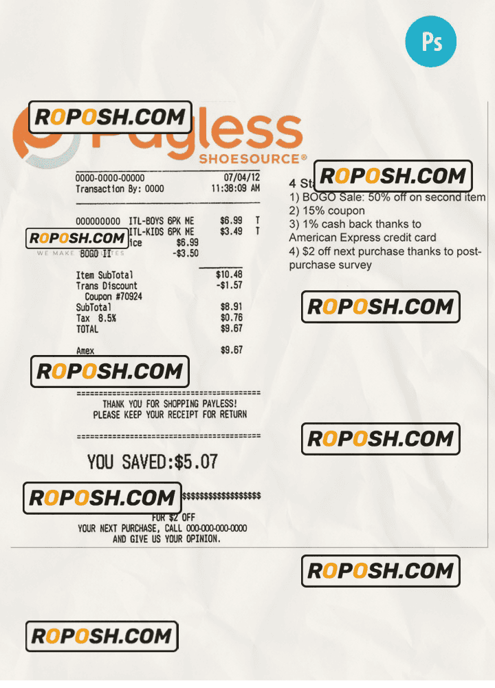 A collection of PAYLESS payment receipt samples can act as proof that a transaction has been successfully completed; for your convenience, editable payments templates options come in various formats, including Word, Excel, PDF, PSD, Docs and Google Sheets. We provide store receipts’ templates for different types of usages, such as sales, rent, pharmacy, food, and donation receipts from renown markets, services, and shops. Our goal is to offer you reliable and professional design pay editable options that help you manage your finances gals.