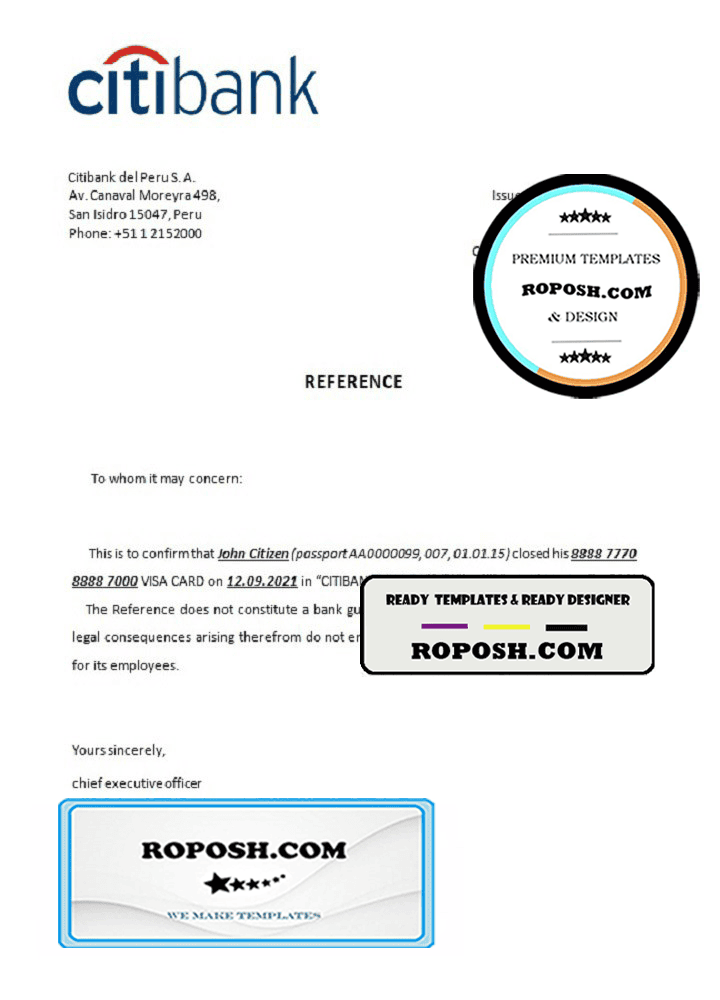 Peru Citibank bank account closure reference letter template in Word and PDF format