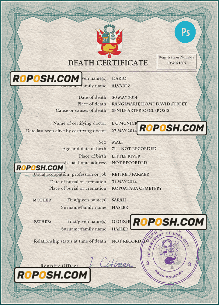 Explore a vast collection of legitimate-looking editable death certificates for several countries worldwide. The editable Peru death certificates offers easy access to obtaining the required document for a variety of purposes, predominantly claiming life insurance, pensions, and resolving estates.