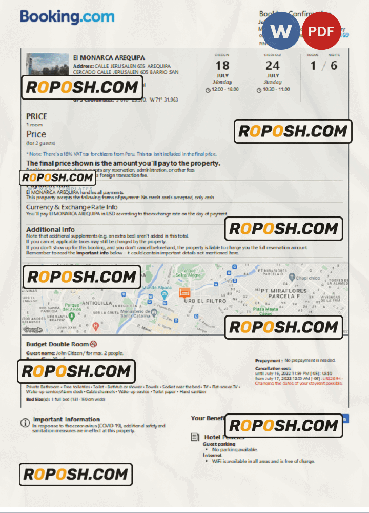 This Blank Peru hotel booking confirmation PDF Template is perfect for a variety of uses, such as Visa applications, proof of accommodation, showing your expenses, and more. You can even use it to create realistic copies of your credit card for novelty documents. We have a variety of other templates available, including passport templates, ID card templates, reciept template, and more.