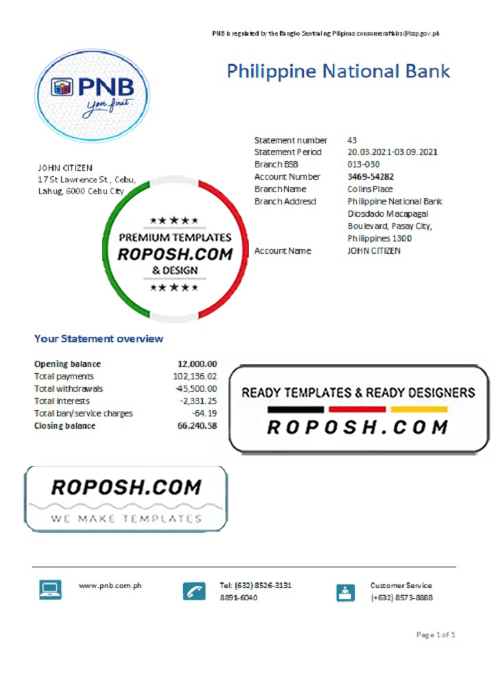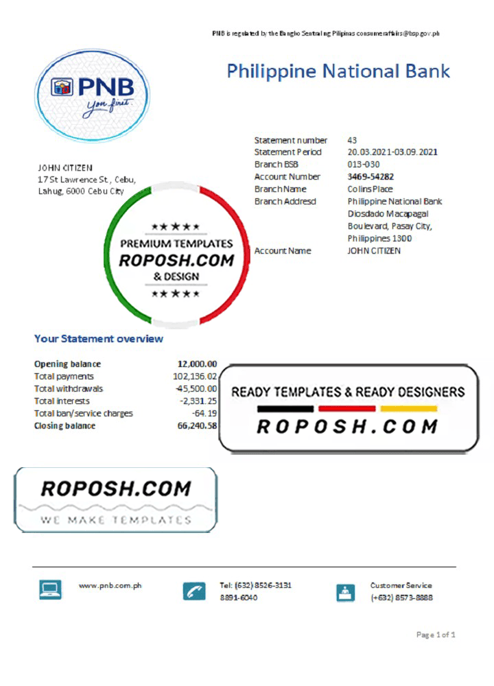 Grab now fully editable Philippines National Bank (PNB) proof of address bank statement Excel Template from our website Roposh and put your own info to create Realistic Bank Statement template Excel and ready your own novelty documents. It’ll be so beneficial if your Bank Statement is expired, stolen or not available.We also have editable credit card, ID Card psd template, Bank Statement psd template, drivers license psd template & printable editable blank utility bill template.