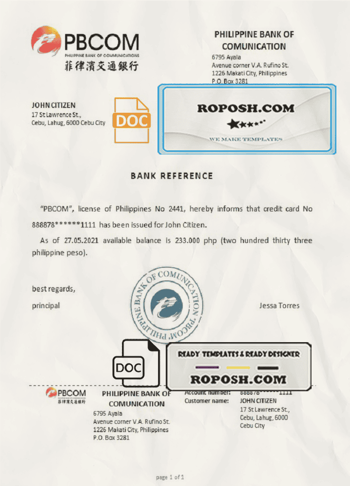 Philippines Pilippine Bank of Comunication bank reference letter template in Word and PDF format