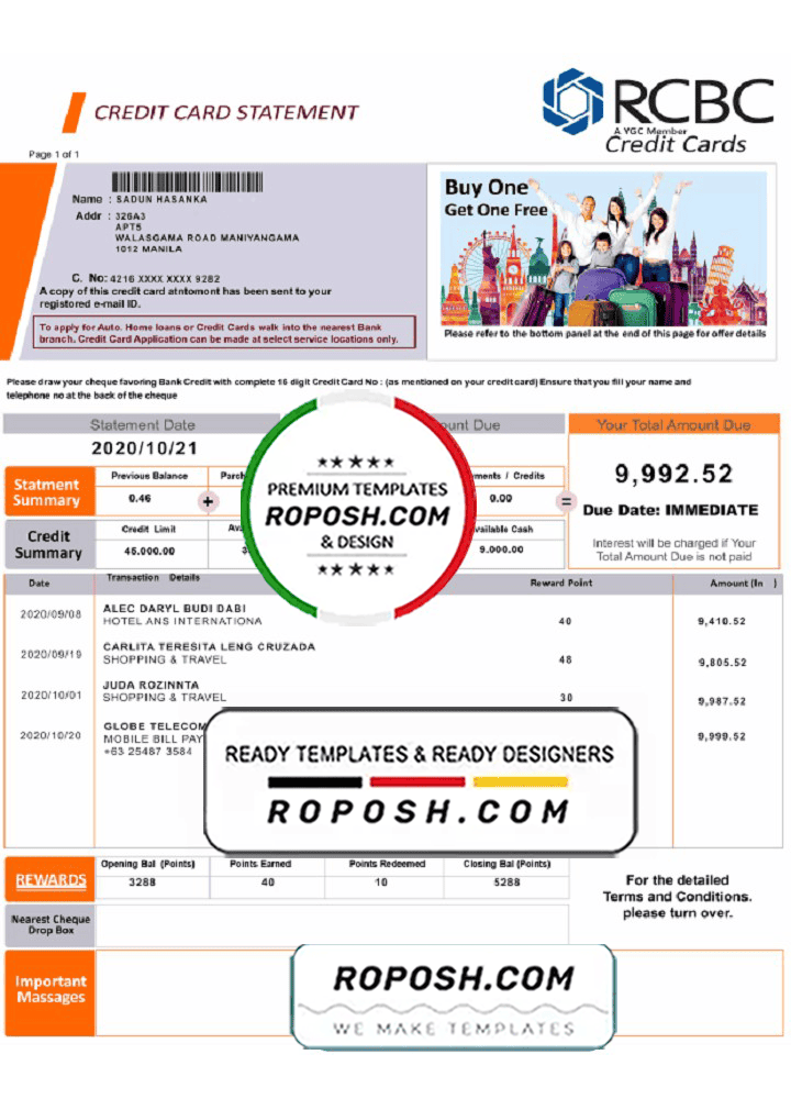 Grab now fully editable Philippines Rizal Commercial Banking Corporation (RCBC) credit card statement Word Template from our website Roposh and put your own info to create Realistic Bank Statement Word template and ready your own novelty documents. It’ll be so beneficial if your Bank Statement is expired, stolen or not available.We also have editable credit card, ID Card psd template, Bank Statement psd template, drivers license psd template & printable editable blank utility bill template.