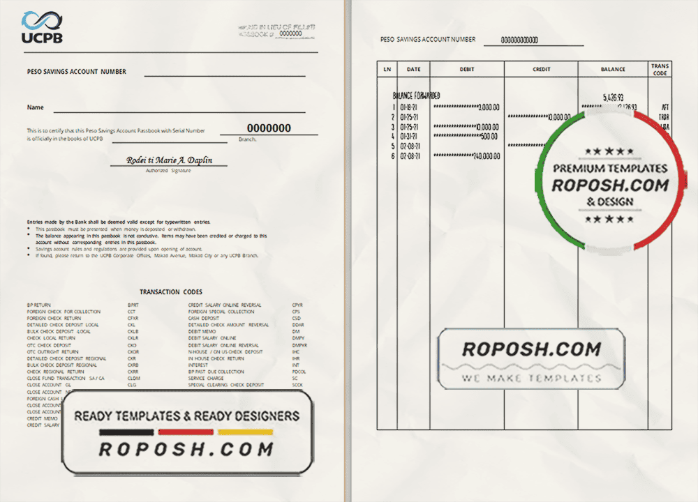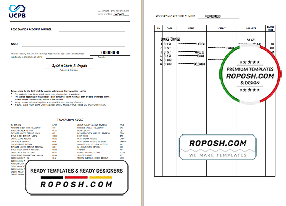 Get your fully editable Philippines UCPB bank statement template from Roposh today. Customize it with your information to create realistic novelty documents. This template is perfect if your bank statement is expired, stolen, or unavailable. We also offer editable credit card templates, ID card templates, driver’s license templates, and printable editable blank utility bill templates.