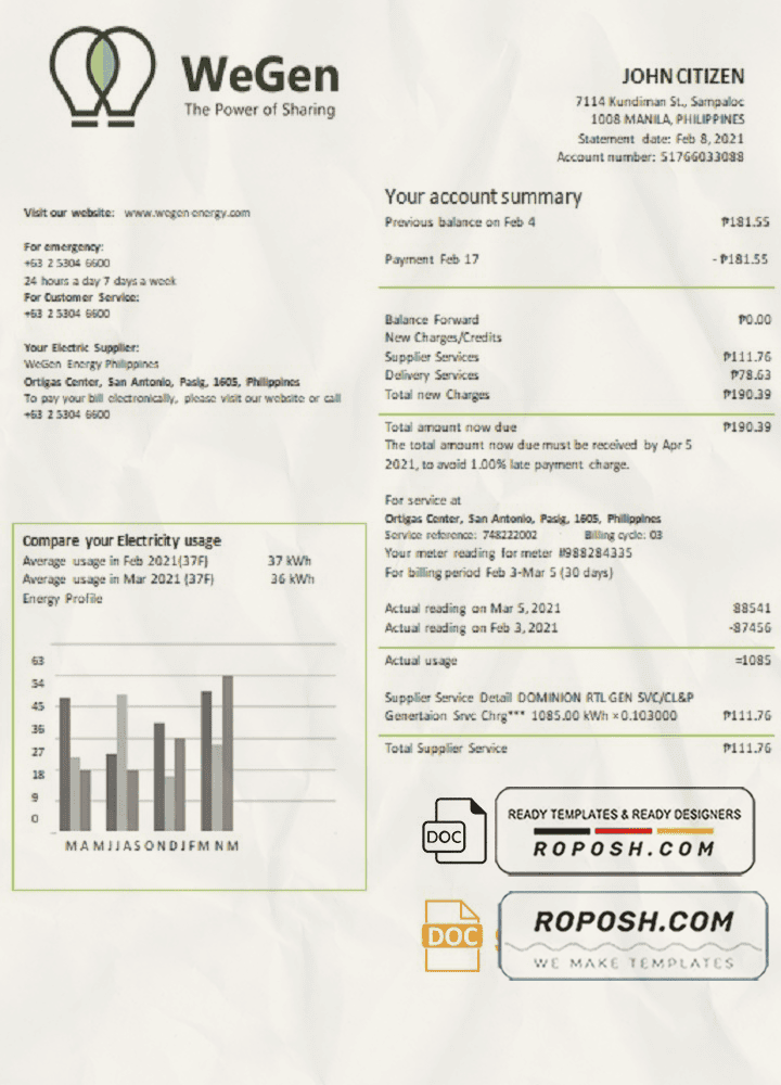 Get your blank Philippines WeGen Energy utility bill template from Roposh today. Customize it with your own information to create a realistic copy for proof of address. Ideal for situations where your utility bill is expired, stolen, or unavailable. We also offer a variety of other templates, including passport PSD templates, ID card PSD templates, bank statement PSD templates, driver’s license PSD templates, and utility bill PSD templates.