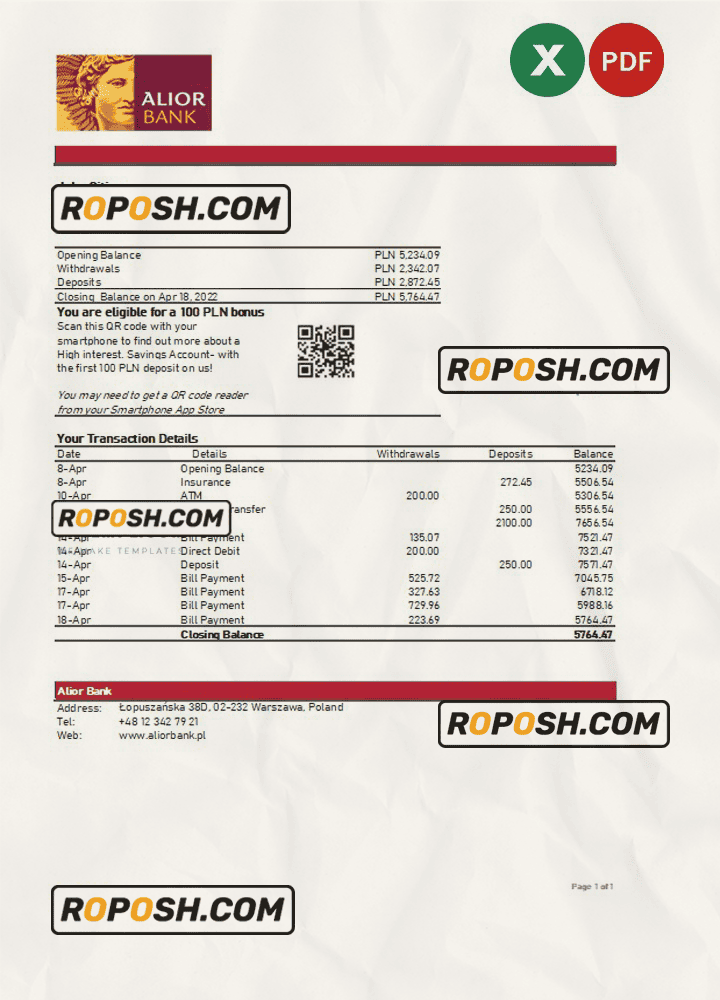 Poland Alior bank statement Template in Excel an PDF format use for :
