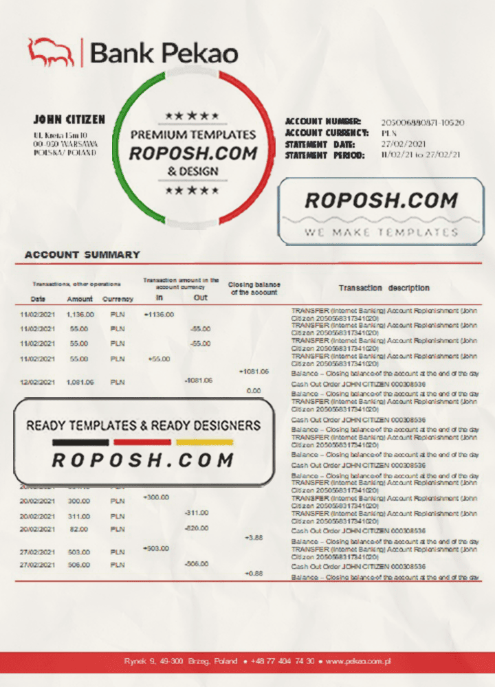 Grab now fully editable Poland Bank Pekao S.A. bank statement easy to fill Excel Template from our website Roposh and put your own info to create Realistic Bank Statement template Excel and ready your own novelty documents. It’ll be so beneficial if your Bank Statement is expired, stolen or not available.We also have editable credit card, ID Card psd template, Bank Statement psd template, drivers license psd template & printable editable blank utility bill template.