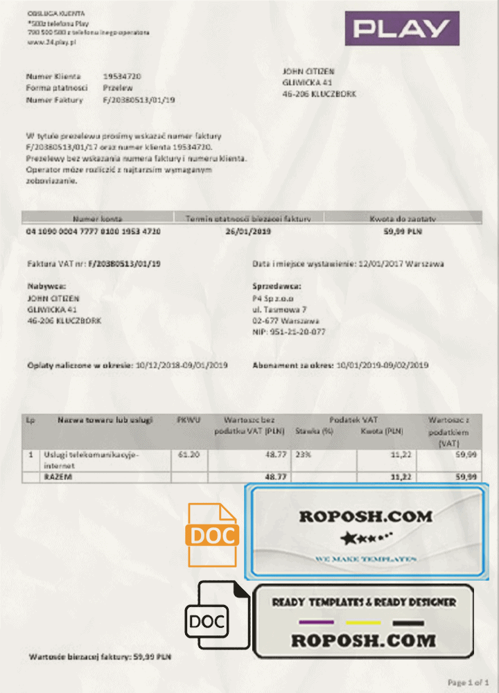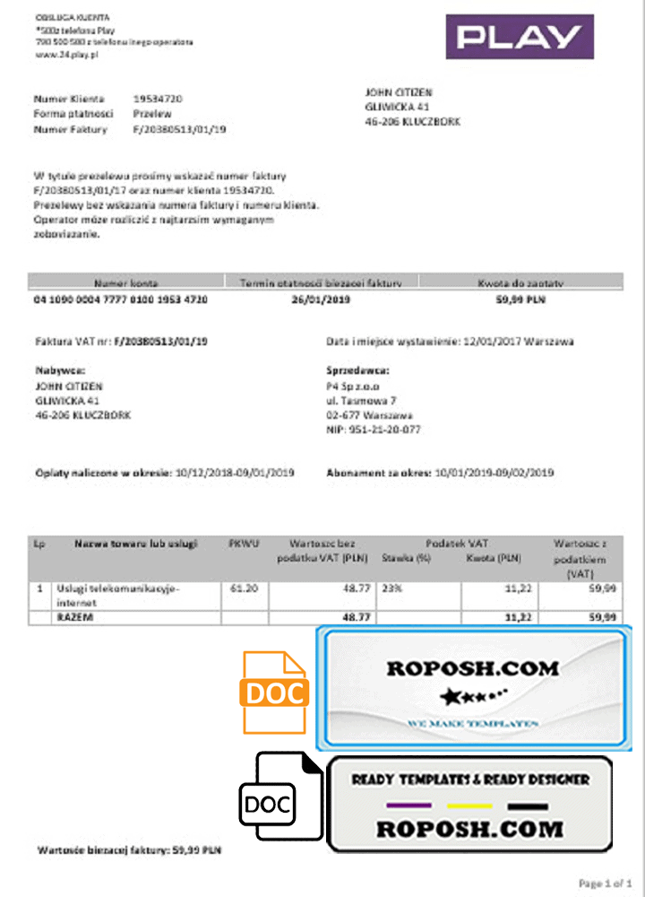 Download our high-quality, fully editable Poland Play Utility Bill Word template. This customizable template is layer-based and includes all necessary fonts. Easily modify the template to create a realistic utility bill with any name, address, license number, ID number, birth date, height, weight, expiration date, and more. Perfect for creating a proof of address document quickly and efficiently.