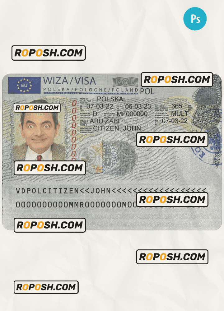 POLAND travel visa template psd. Buy Customizable Travel Visa Template with high quality and enjoy its unique features such as easy to customize, Layer based, fonts included sample. you can edit this template and put any name, address, license number, Id number, birth date, height, weight, expire date, change photos etc. This Photoshop template is a layer based psd file and it’s easy to Editing.To modify this photoshop template file you will need a Photo editing software such as Adobe Photoshop No need to be expert on editing software like adobe Photoshop. However, You just have to basic knowledge on adobe photoshop, to edit this template. Never used low quality template. Your account may be suspended. Also, if you’re looking for an editable SSN template, Roposh is by your side so you can get it easily and even for free.