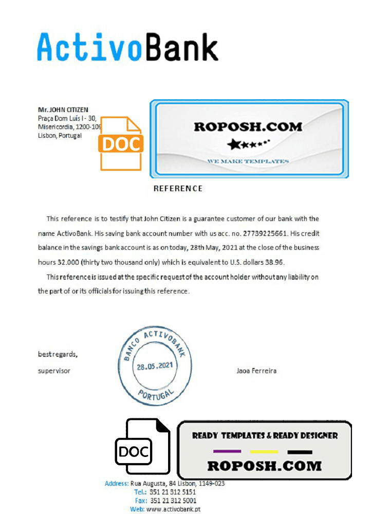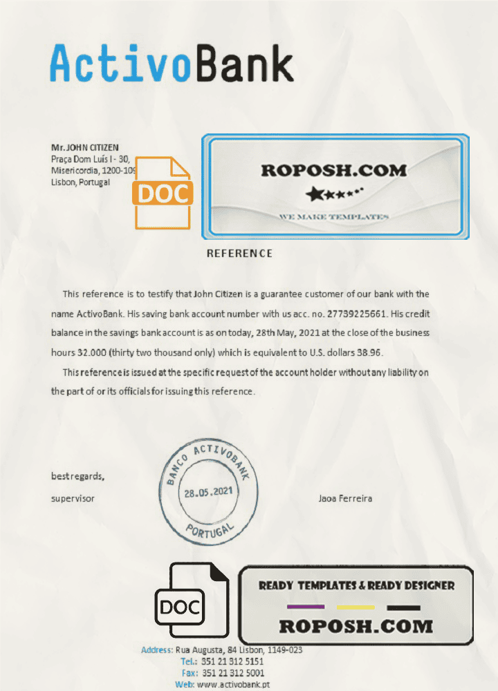 Portugal Activobank bank account reference letter template in Word and PDF format
