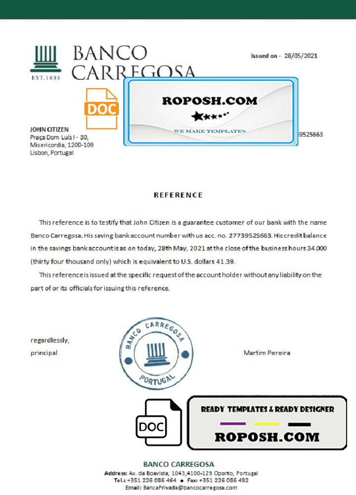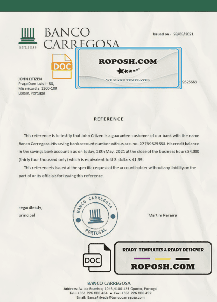 Portugal Banco Carregosa bank account reference letter template in Word and PDF format