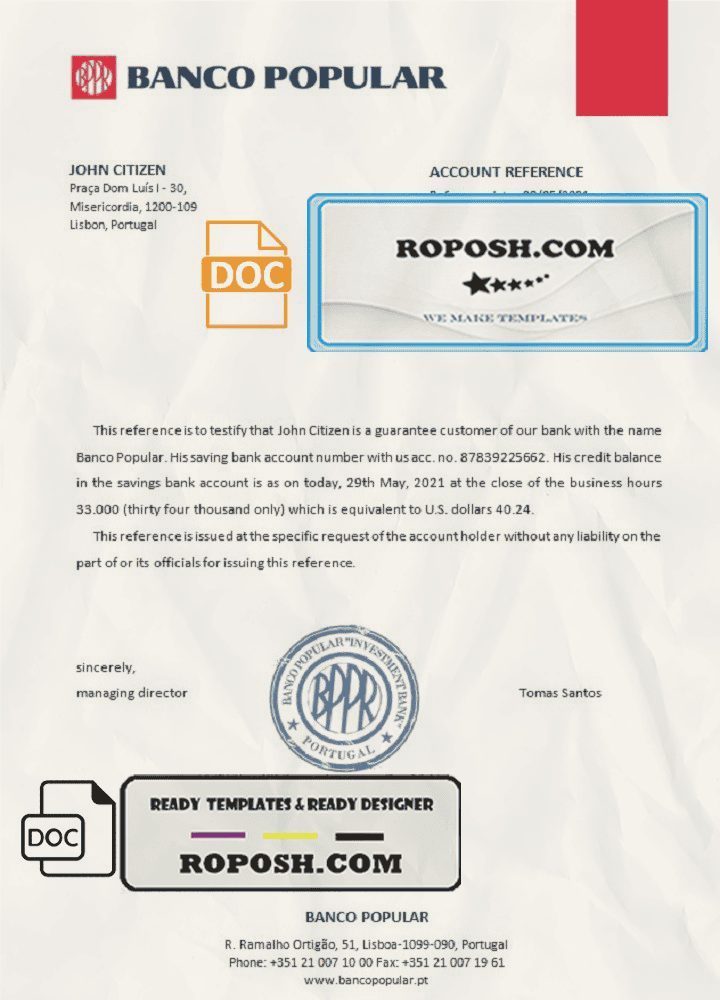 Portugal Banco Popular bank account reference letter template in Word and PDF format