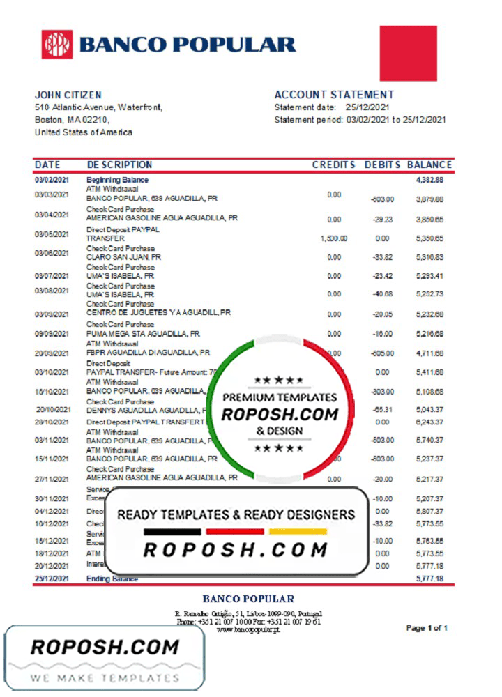 Grab now fully editable Portugal Banco Popular bank statement Excel Template from our website Roposh and put your own info to create Realistic Bank Statement template Excel and ready your own novelty documents. It’ll be so beneficial if your Bank Statement is expired, stolen or not available.We also have editable credit card, ID Card psd template, Bank Statement psd template, drivers license psd template & printable editable blank utility bill template.