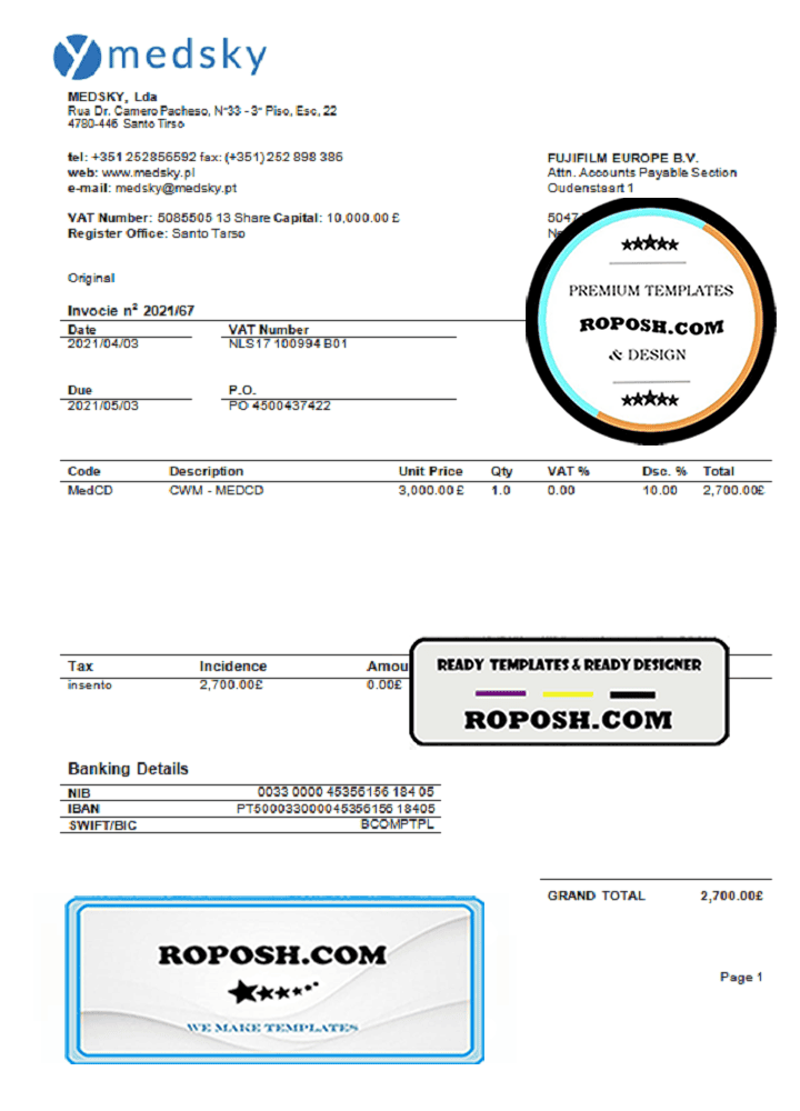 Featuring a wide range of templates from all over the world, the Portugal Medsky Lda company invoice Word Template is fully customizable, and included fonts. Edit all relevant details, such as name, photo, signature, barcodes, and holograms, to create a realistic, high-quality editable invoice template.