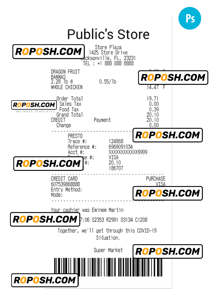 A collection of PUBLIC’S STORE payment receipt samples can act as proof that a transaction has been successfully completed; for your convenience, editable payments templates options come in various formats, including Word, Excel, PDF, PSD, Docs and Google Sheets. We provide store receipts’ templates for different types of usages, such as sales, rent, pharmacy, food, and donation receipts from renown markets, services, and shops. Our goal is to offer you reliable and professional design pay editable options that help you manage your finances gals.