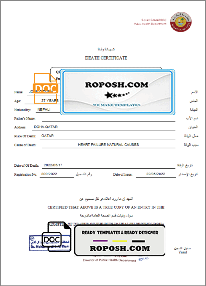 Qatar death certificate template in Word and PDF format