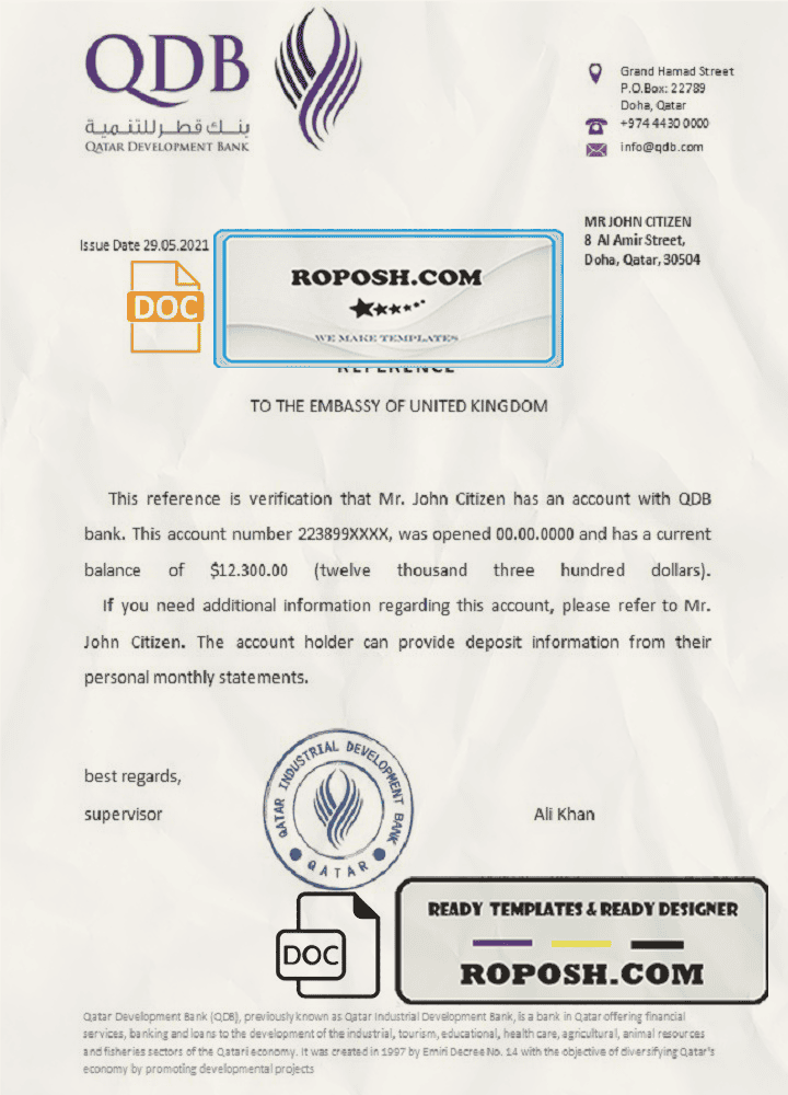 Qatar Development Bank bank account reference letter template in Word and PDF format