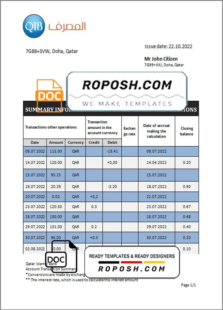 Download our fully editable Qatar Islamic Bank Statement Word Template from Roposh and personalize it to create your own novelty documents. This template is beneficial if your bank statement is expired, stolen, or unavailable. We also offer editable credit card templates, ID card templates, bank statement PSD templates, driver’s license PSD templates, and printable editable blank utility bill templates.