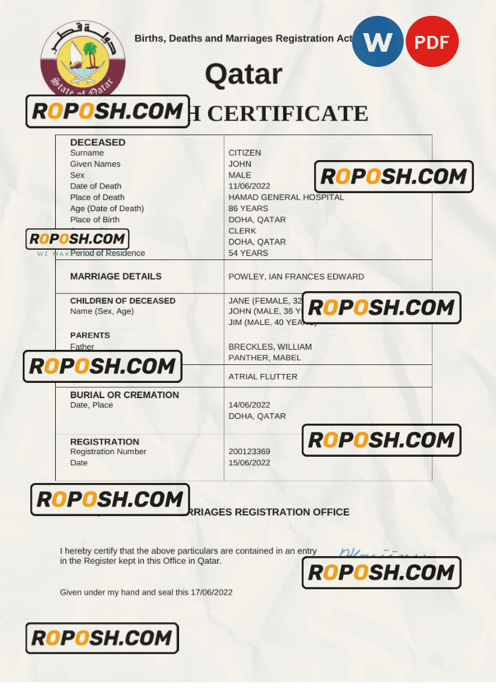 Explore a vast collection of legitimate-looking editable death certificates for several countries worldwide. The editable Qatar death certificates offers easy access to obtaining the required document for a variety of purposes, predominantly claiming life insurance, pensions, and resolving estates.
