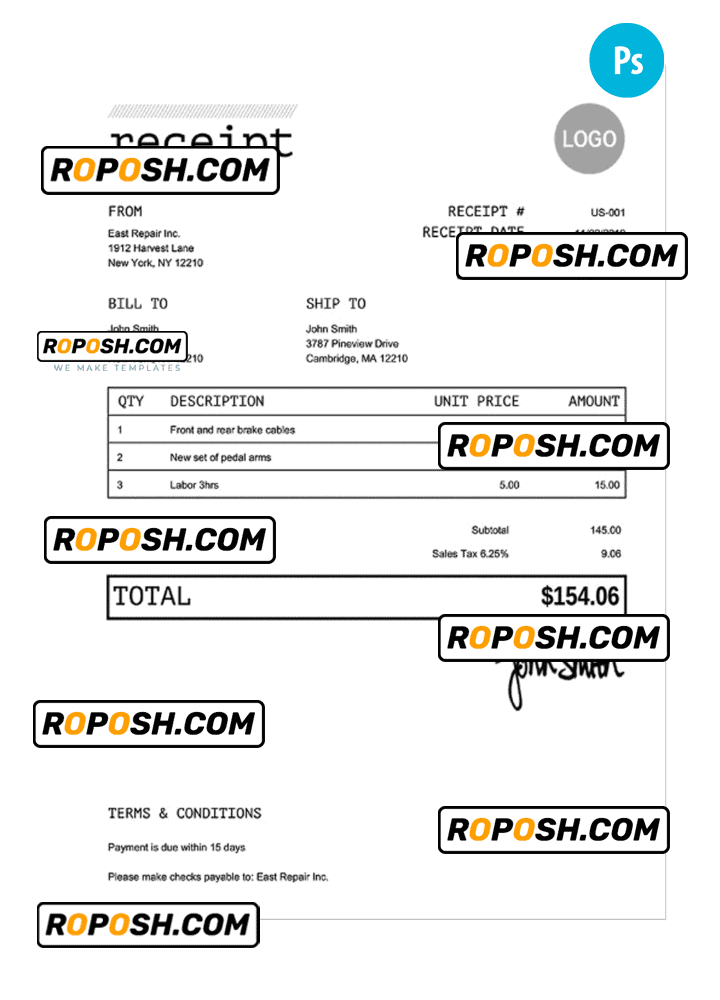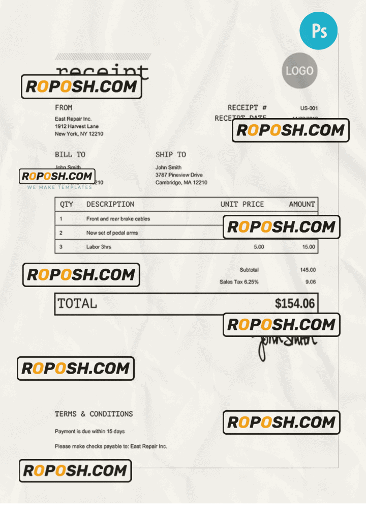 Features Editable RECEIPT Receipt PSD Template :