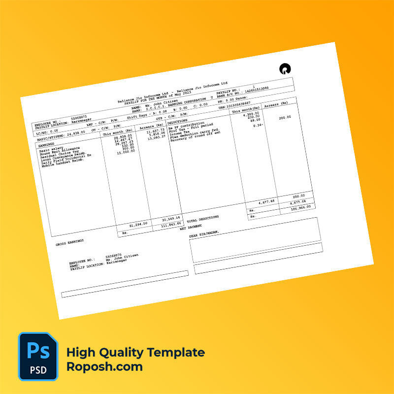 Reliance Jio Infocomm Ltd payslip word and pdf template