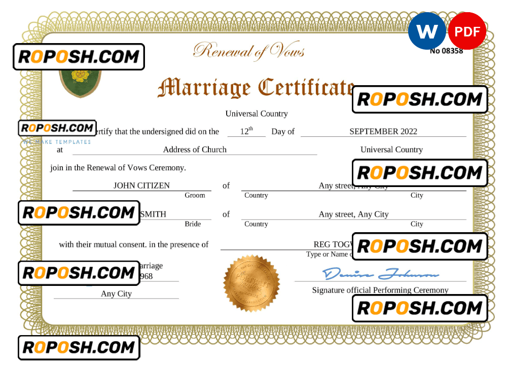 Choose roposh and appreciate the pleasure of a beautiful, authentic-looking Marriage Certificate you can print at home or at your local print shop for a polished presentation.