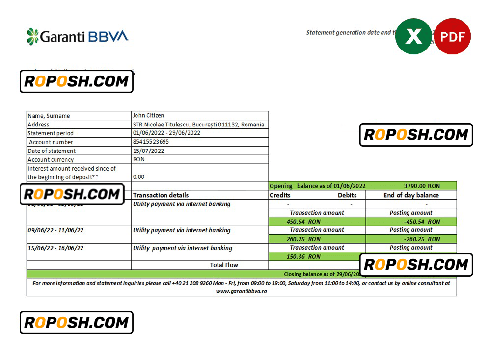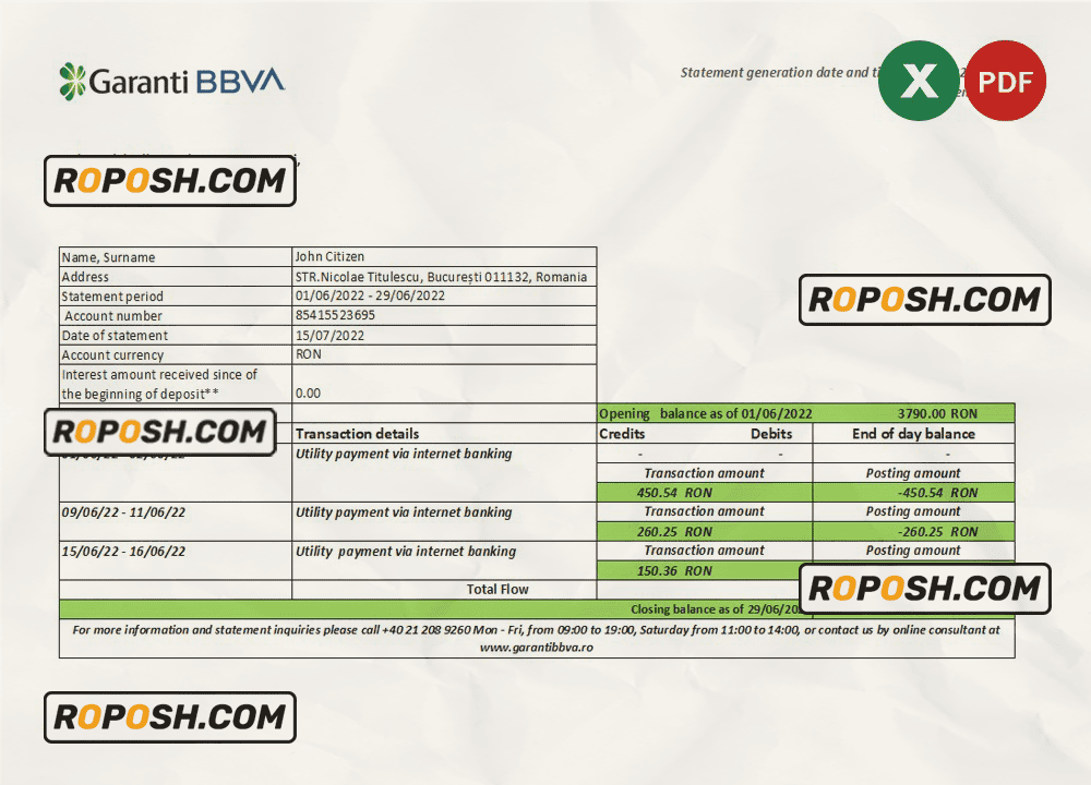 Romania Garanti BBVA Bank Statement Template in Excel and PDF Format