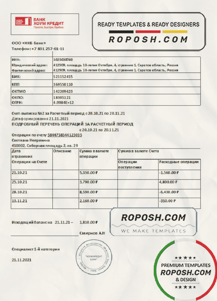 Russia Home Credit bank statement template in Word and PDF format, good for address prove