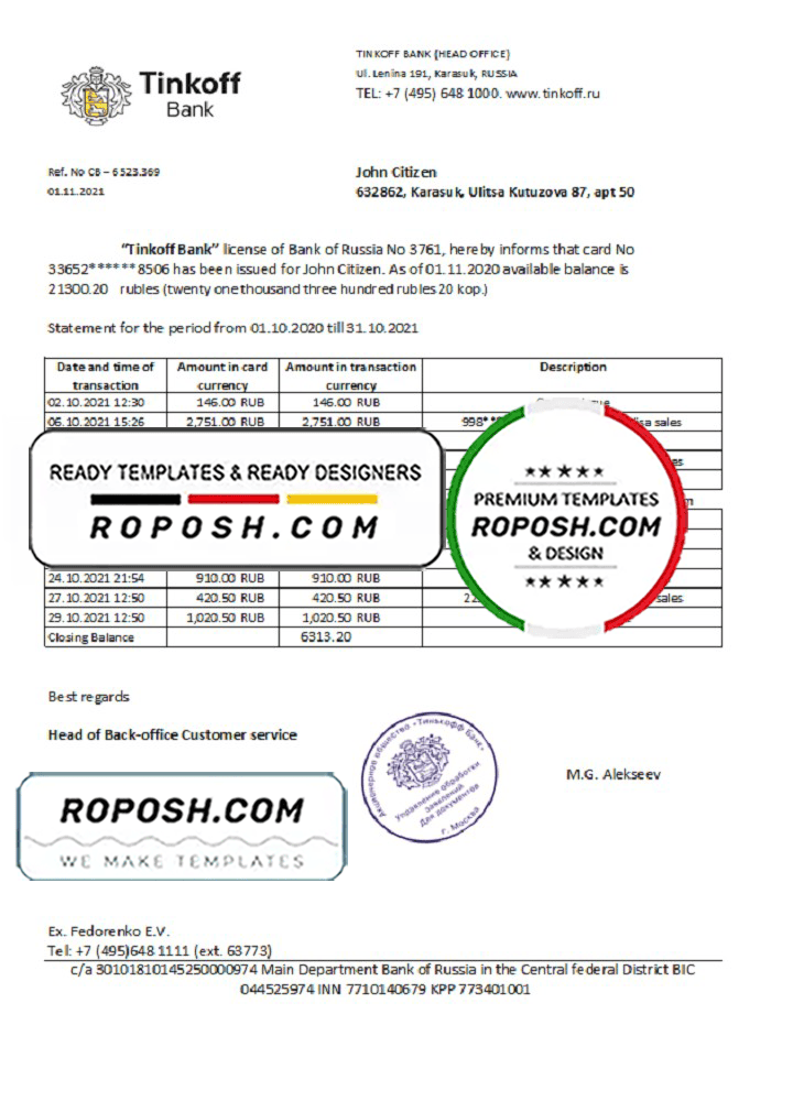 Russia Tinkoff bank proof of address statement Word and Pdf Template use for :