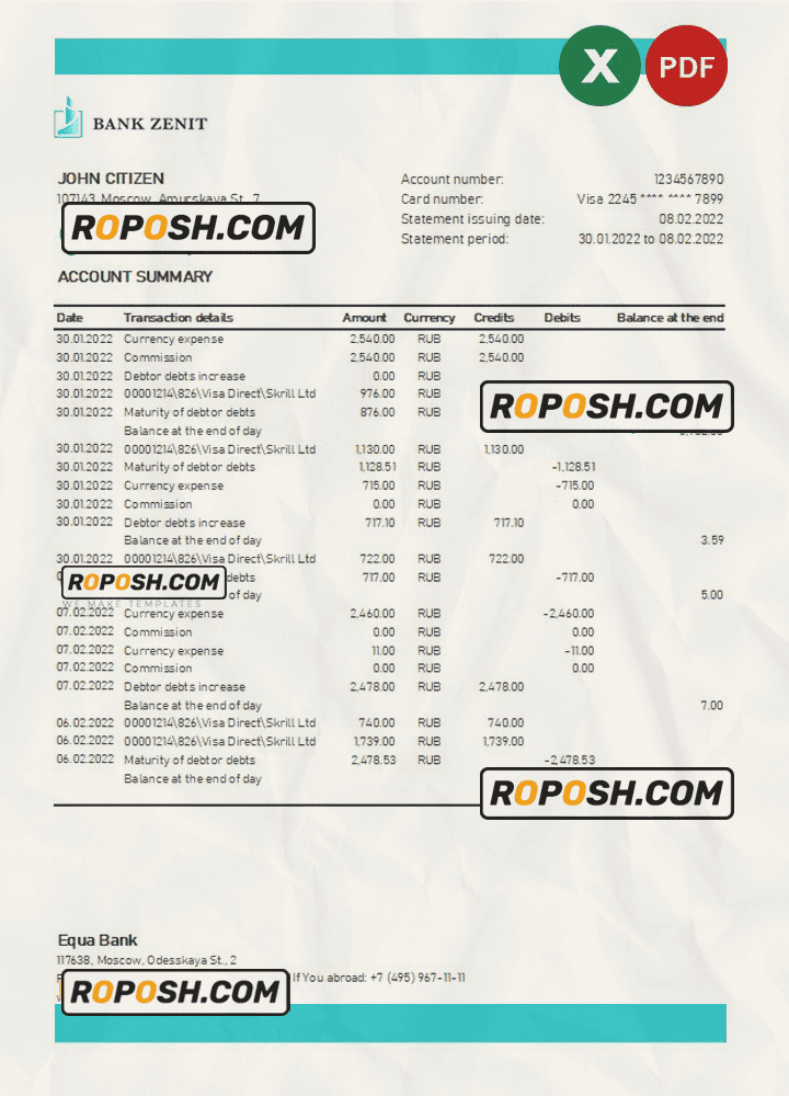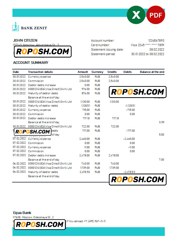 Russia Zenit bank statement Template in Excel an PDF format use for :