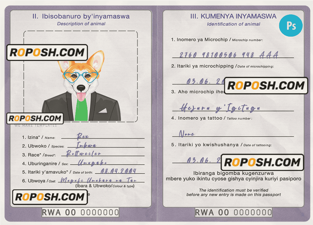 Rwanda dog (animal, pet) passport PSD template, is your one-stop-shop for realistic and editable editable pet identity cards and passports. We specialize in creating high-quality, customizable editable pet passports and identity cards for dogs, cats, and other furry friends.