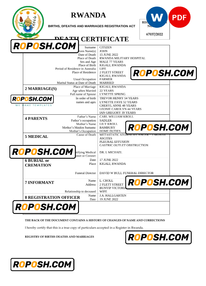 Explore a vast collection of legitimate-looking editable death certificates for several countries worldwide. The editable Rwanda death certificates offers easy access to obtaining the required document for a variety of purposes, predominantly claiming life insurance, pensions, and resolving estates.