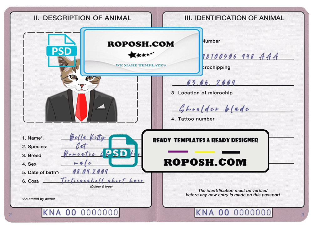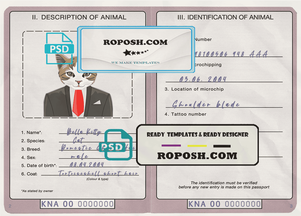 Saint Kitts and Nevis cat (animal, pet) passport PSD template, is designed to look and feel like real documents. Each template is carefully crafted to include all the necessary details, such as your pet’s name, breed, date of birth, and microchip information. With our fillable cat or dog passport templates, you can quickly and easily create a editable pet passport that meets all the requirements for international travel.