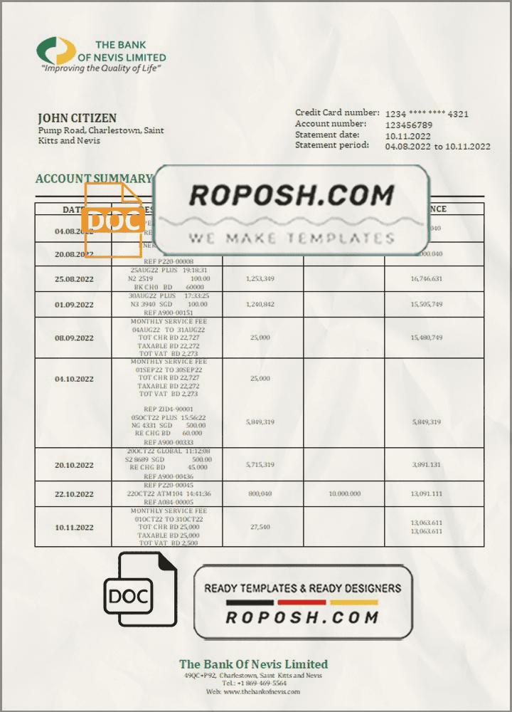 Get your fully editable Saint Kitts and Nevis The Bank of Nevis Bank Proof of Address Statement Word Template from Roposh. Customize it with your information to create a realistic fake bank statement. Ideal if your bank statement is expired, stolen, or unavailable. We also offer editable credit card, ID card PSD templates, bank statement PSD templates, driver’s license PSD templates, and printable editable blank utility bill templates.