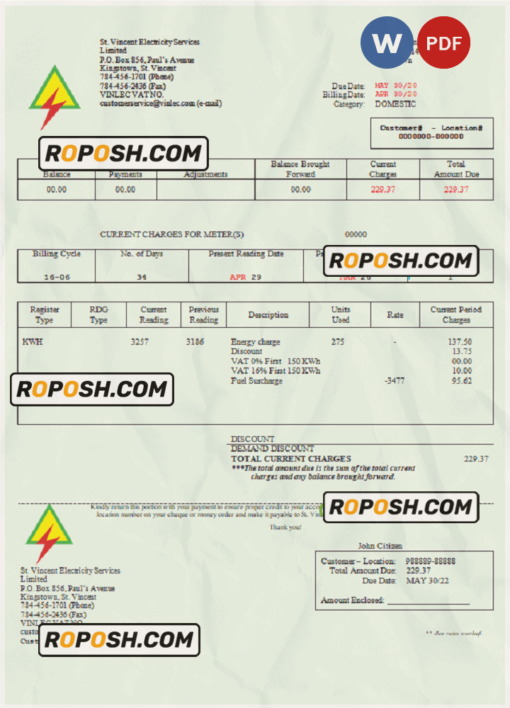 Get your blank Saint Vincent and the Grenadines St. Vincent Electricity Services Limited utility bill template from Roposh. Customize it with your own information to create a editable utility bill for proof of address. Ideal for situations where your utility bill is expired, stolen, or unavailable. Explore our other templates, including passport PSD templates, ID card PSD templates, bank statement PSD templates, driver’s license PSD templates, and more.