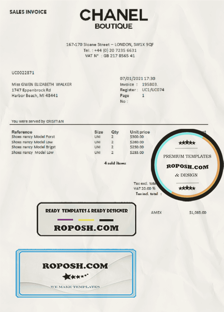 Featuring a wide range of templates from all over the world, the Sales Invoice Chanel Boutique Word Template is fully customizable, and included fonts. Edit all relevant details, such as name, photo, signature, barcodes, and holograms, to create a realistic, high-quality editable invoice template.