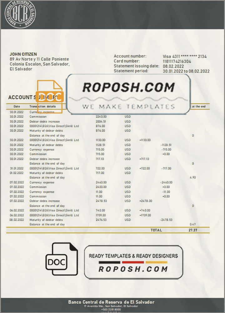Get your fully editable Salvador Banco Central de Reserva de El Salvador Bank Statement Word Template from Roposh and customize it with your own information to create a realistic fake bank statement. This is especially useful if your bank statement is expired, stolen, or unavailable. We also offer editable credit card, ID card PSD templates, bank statement PSD templates, driver’s license PSD templates, and printable editable blank utility bill templates.