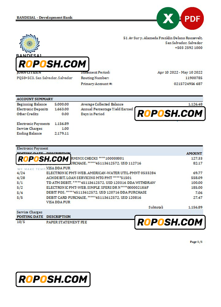 Grab now fully editable Salvador Bandesal bank statement Excel Template from our website Roposh and put your own info to create Realistic Bank Statement template Excel and ready your own novelty documents. It’ll be so beneficial if your Bank Statement is expired, stolen or not available.We also have editable credit card, ID Card psd template, Bank Statement psd template, drivers license psd template & printable editable blank utility bill template.