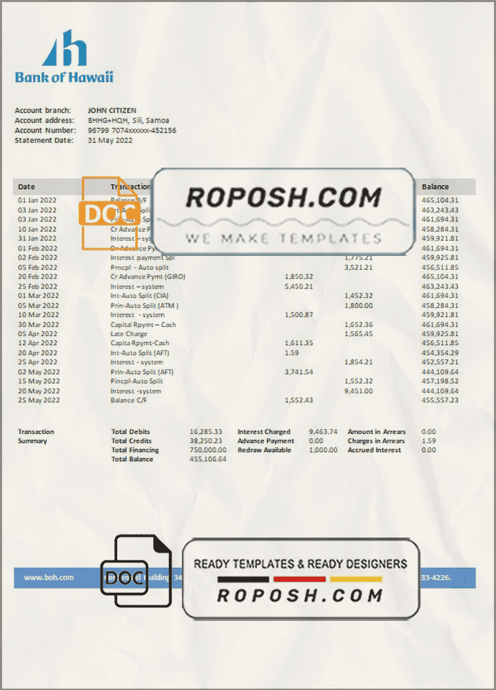 Get your fully editable Samoa Bank of Hawaii Bank Proof of Address Statement Word Template from Roposh and customize it with your information to create a realistic fake bank statement. This is especially useful if your bank statement is expired, stolen, or unavailable. We also offer editable credit card templates, ID card PSD templates, bank statement PSD templates, driver’s license PSD templates, and printable editable blank utility bill templates.