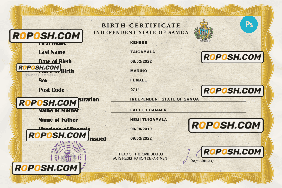 roposh offers hundreds of high-quality, realistic, and customizable birth certificates. The Samoa birth certificate template is fully fillable, and you can complete it with any information you wish, such as name, surname, birth date, place of birth and etc. Whether you are using our PSD template (a layer-based adobe photoshop file) or our PDF template (a Microsoft Office editable file) you will get a package with fonts included instantly. No need to worry even if you can’t generate realistic birth proof yourself, we offer reliable editing service with your desired information for an extra charge. Also, we are always online and here to help you experience a confident purchase. So, reach out!