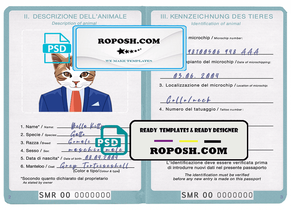 San Marino cat (animal, pet) passport PSD template, is designed to look and feel like real documents. Each template is carefully crafted to include all the necessary details, such as your pet’s name, breed, date of birth, and microchip information. With our fillable cat or dog passport templates, you can quickly and easily create a editable pet passport that meets all the requirements for international travel.