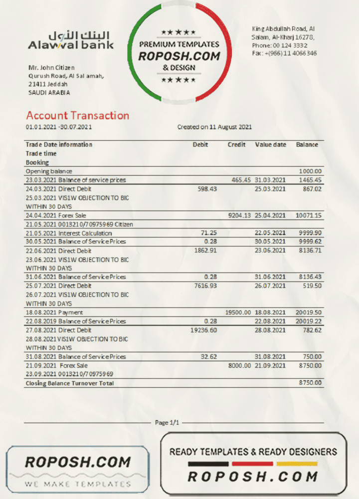 Grab now fully editable Saudi Arabia Alawwal Bank statement easy to fill Excel Template from our website Roposh and put your own info to create Realistic Bank Statement template Excel and ready your own novelty documents. It’ll be so beneficial if your Bank Statement is expired, stolen or not available.We also have editable credit card, ID Card psd template, Bank Statement psd template, drivers license psd template & printable editable blank utility bill template.