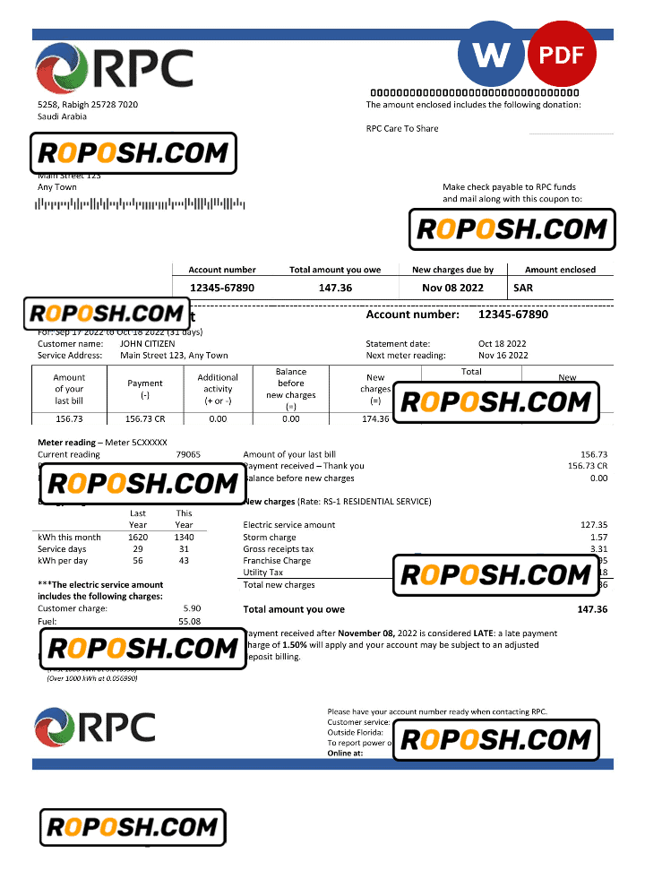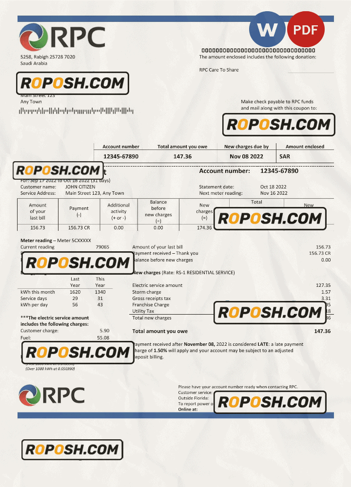 “Get a high-quality Saudi Arabia Rabigh Power Company utility bill template in Word and PDF formats. Perfect for replacing lost documents, identity verification on trade sites, digital currency platforms, and payment services. Ideal for creating realistic fake documents quickly and easily.”