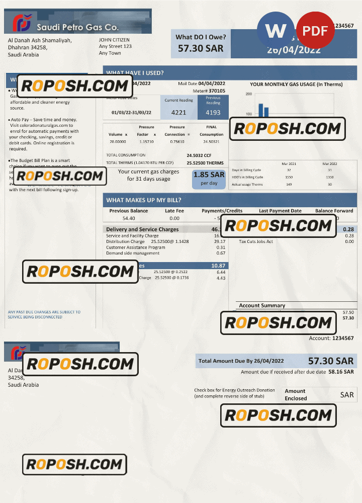 Get your blank Saudi Arabia Petro Gas utility bill template from Roposh today. Customize it with your information to create a convincing editable utility bill for proof of address. This template is especially useful if your original utility bill is expired, lost, or unavailable. We also offer a wide range of other templates, including passport PSD templates, ID card PSD templates, bank statement PSD templates, driver’s license PSD templates, and utility bill PSD templates.