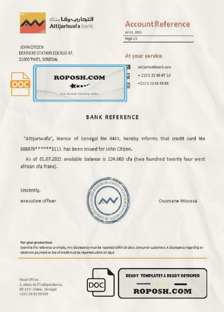 Senegal Attijariwafa bank reference letter template in Word and PDF format