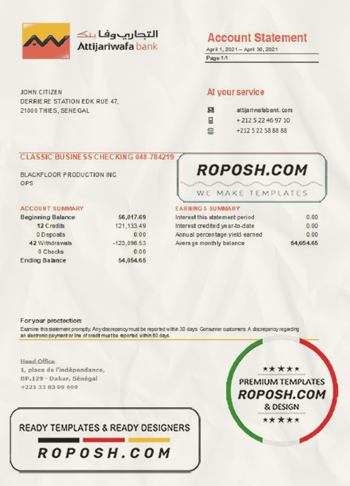 Grab now fully editable Senegal Attijariwafa Bank statement easy to fill Excel Template from our website Roposh and put your own info to create Realistic Bank Statement template Excel and ready your own novelty documents. It’ll be so beneficial if your Bank Statement is expired, stolen or not available.We also have editable credit card, ID Card psd template, Bank Statement psd template, drivers license psd template & printable editable blank utility bill template.